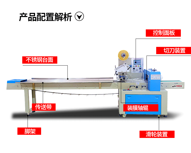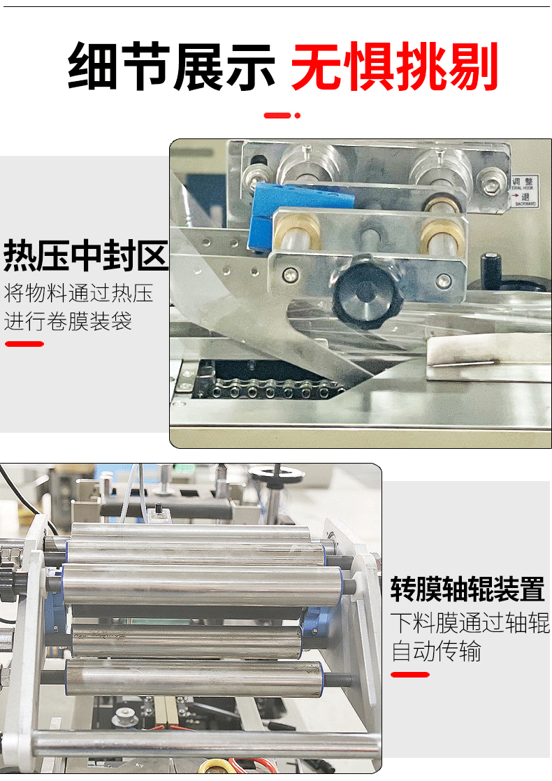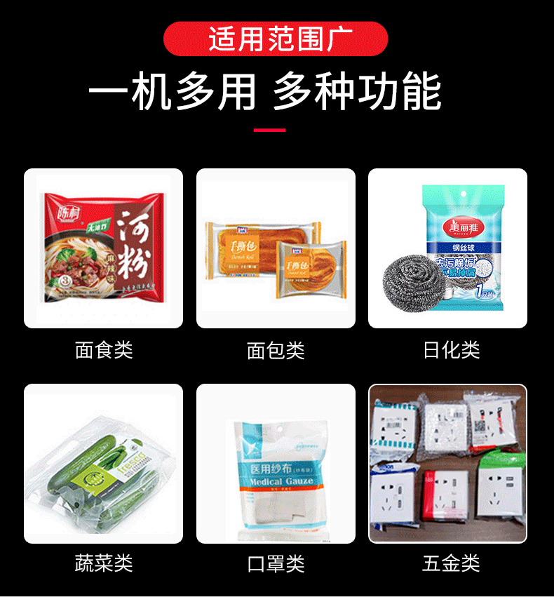 適用于餅干、面包、速食面、月餅、糖果、藥品日用品、五金零件、紙盒或托盤等各類固態有規則的物體的包裝。