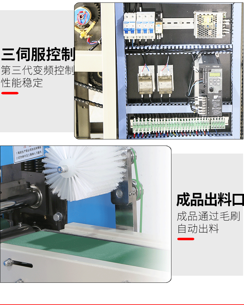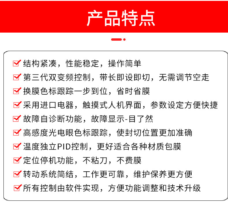 第三代雙變頻控制,袋長即設即切,無需調節空走,換膜色標跟蹤一步到位,省時省膜。